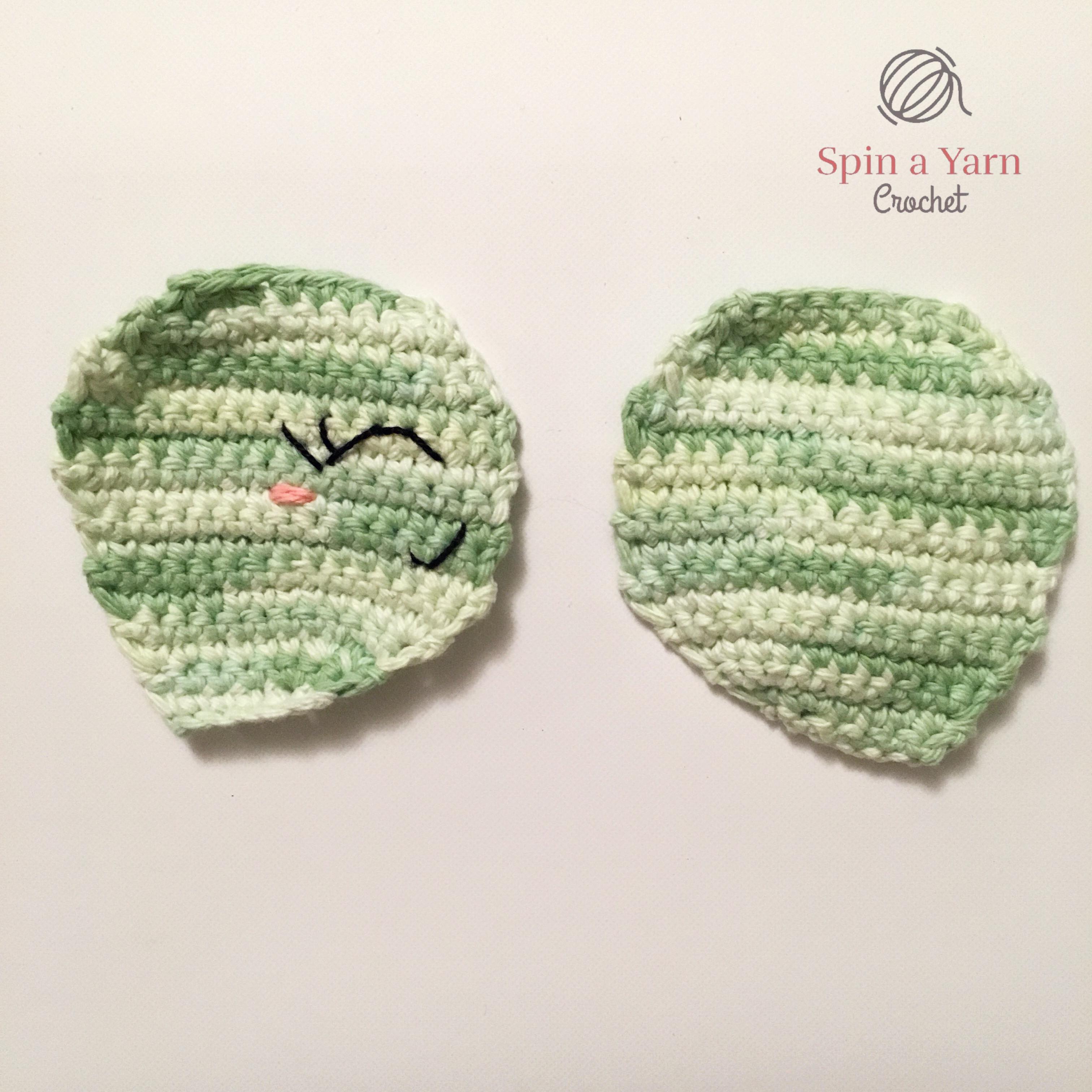 Then place both panels together. In Aloe Vera yarn, ch 1 and single crochet around the outside of the panels. (Sc, ch, sc) in the bottom point. Stuff once you’ve crocheted about two-thirds of the way around. Close with a slst to beginning st. Put aside for assembly later.