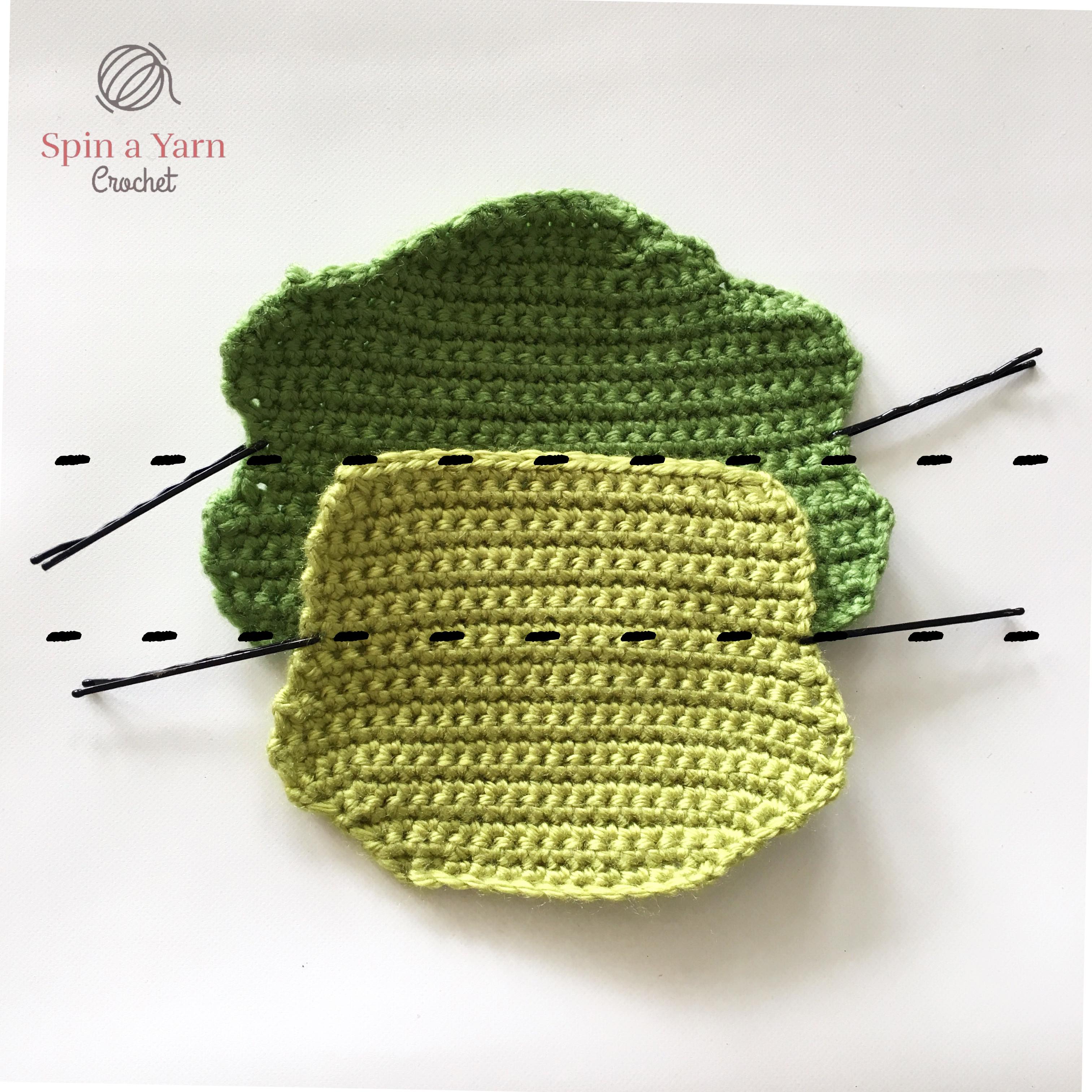 Do the same for the back face panel and the back frill panel. The only difference is that, because the back face panel won’t be seen, we only crocheted to row 13. So, stitch row 13 of the face panel onto the bottom row of the back frill panel using dark green yarn.
