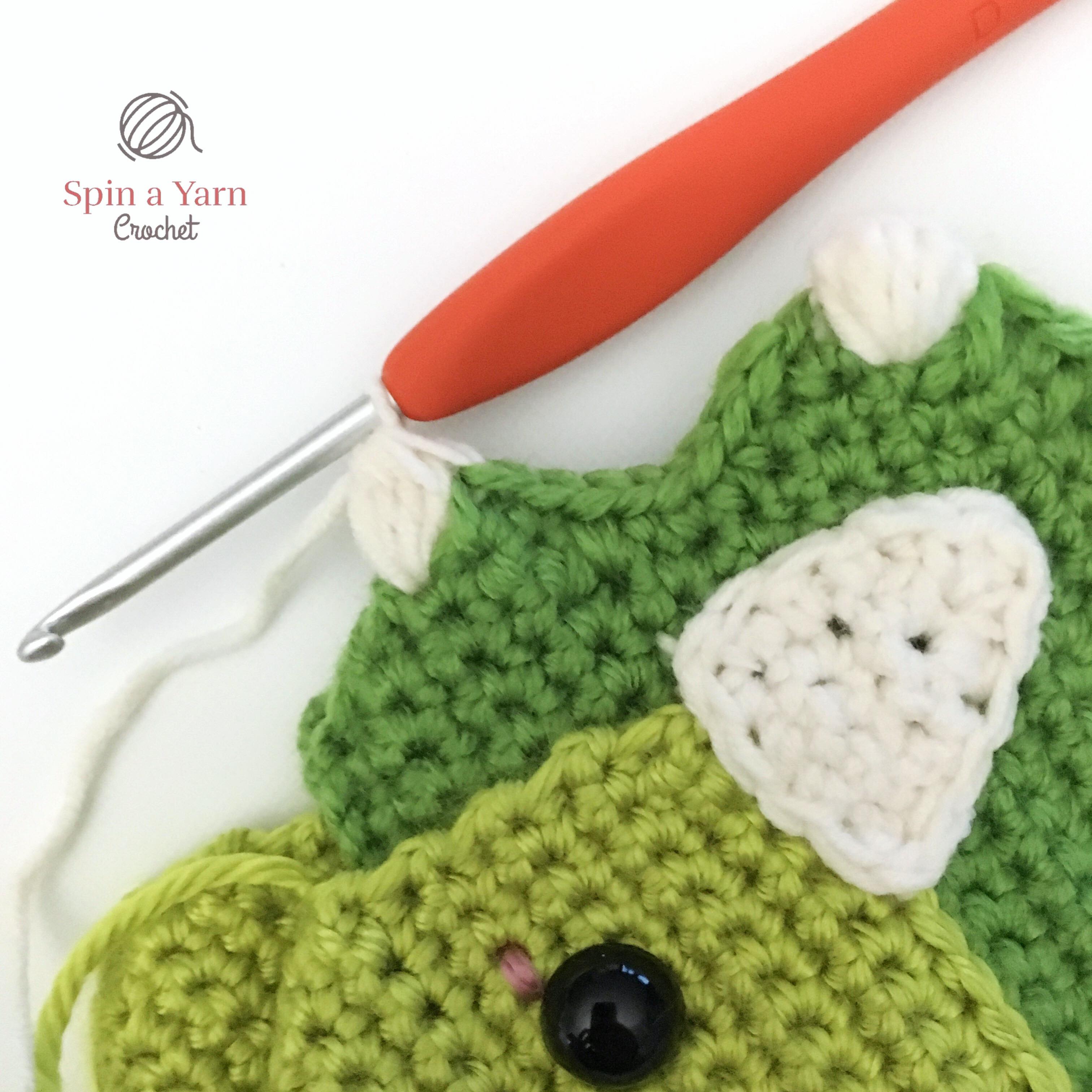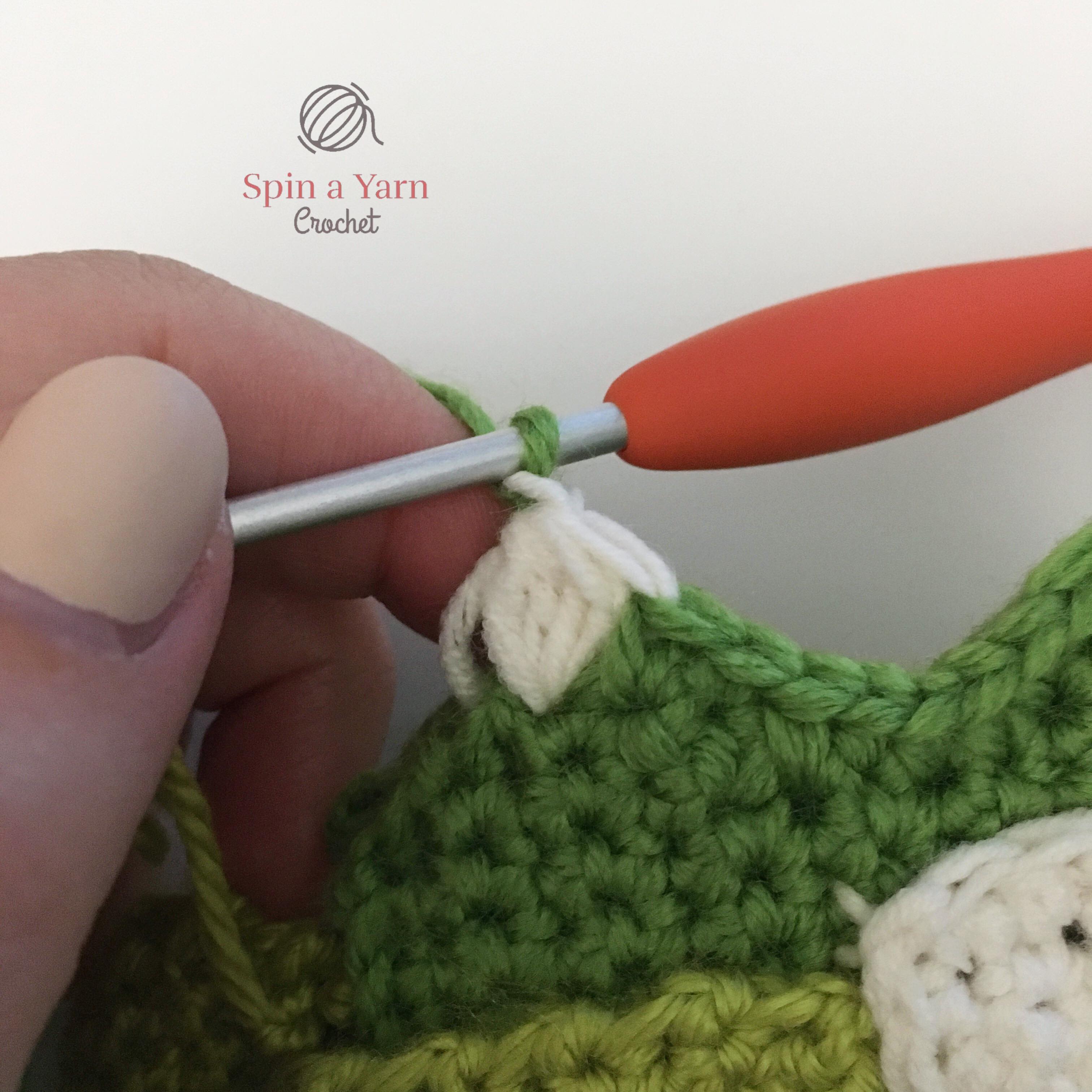 The horns around the frill (i.e. the white points on each bump around the frill) will be crocheted as we go, so stop when you get to the first bump of the frill. To crochet the horn, change to cream yarn (work the previous stitch only halfway and finish with cream yarn), then complete a bobble stitch in the next st. Once the bobble st is completed, ch 1 in cream, then change back to dark green yarn by working a slst.