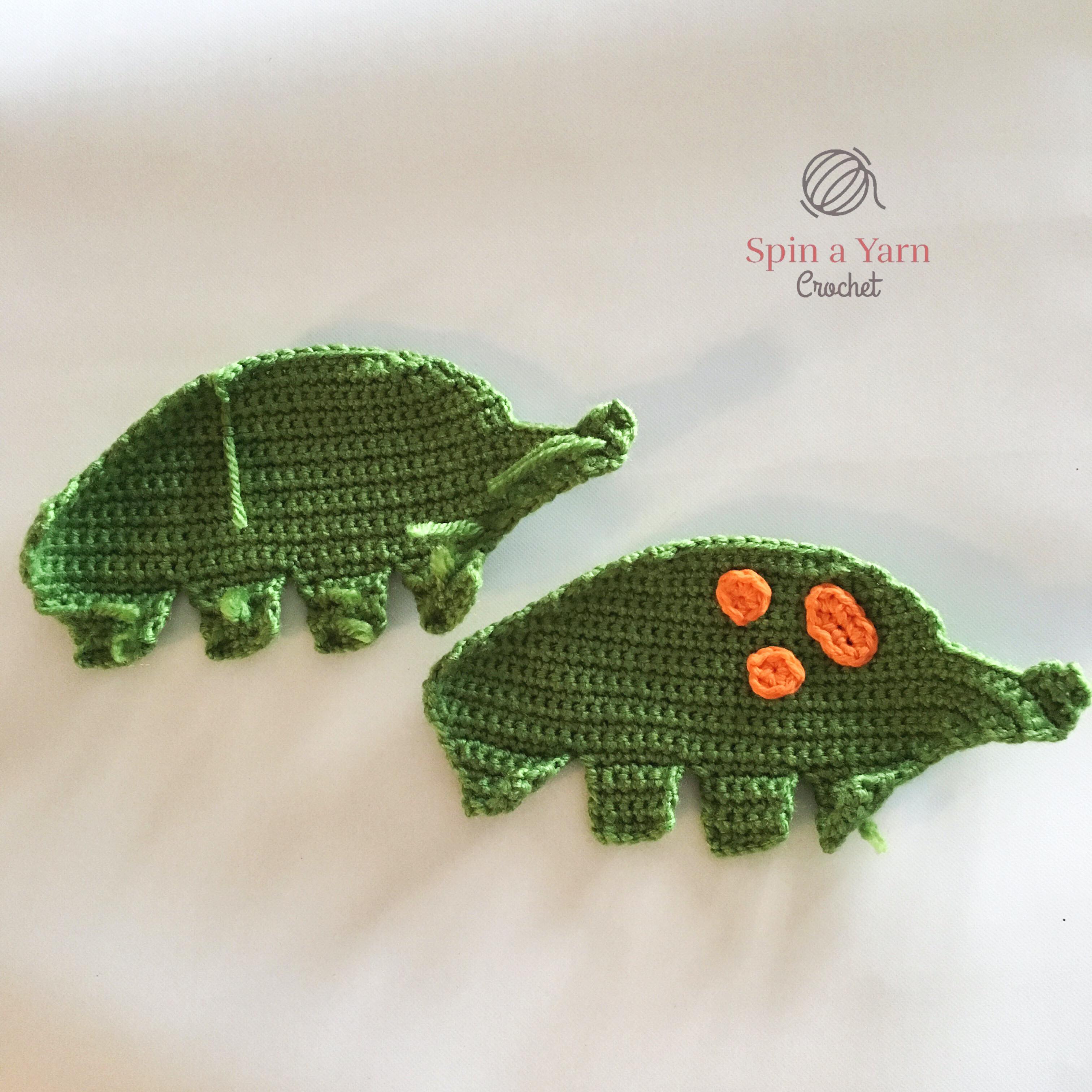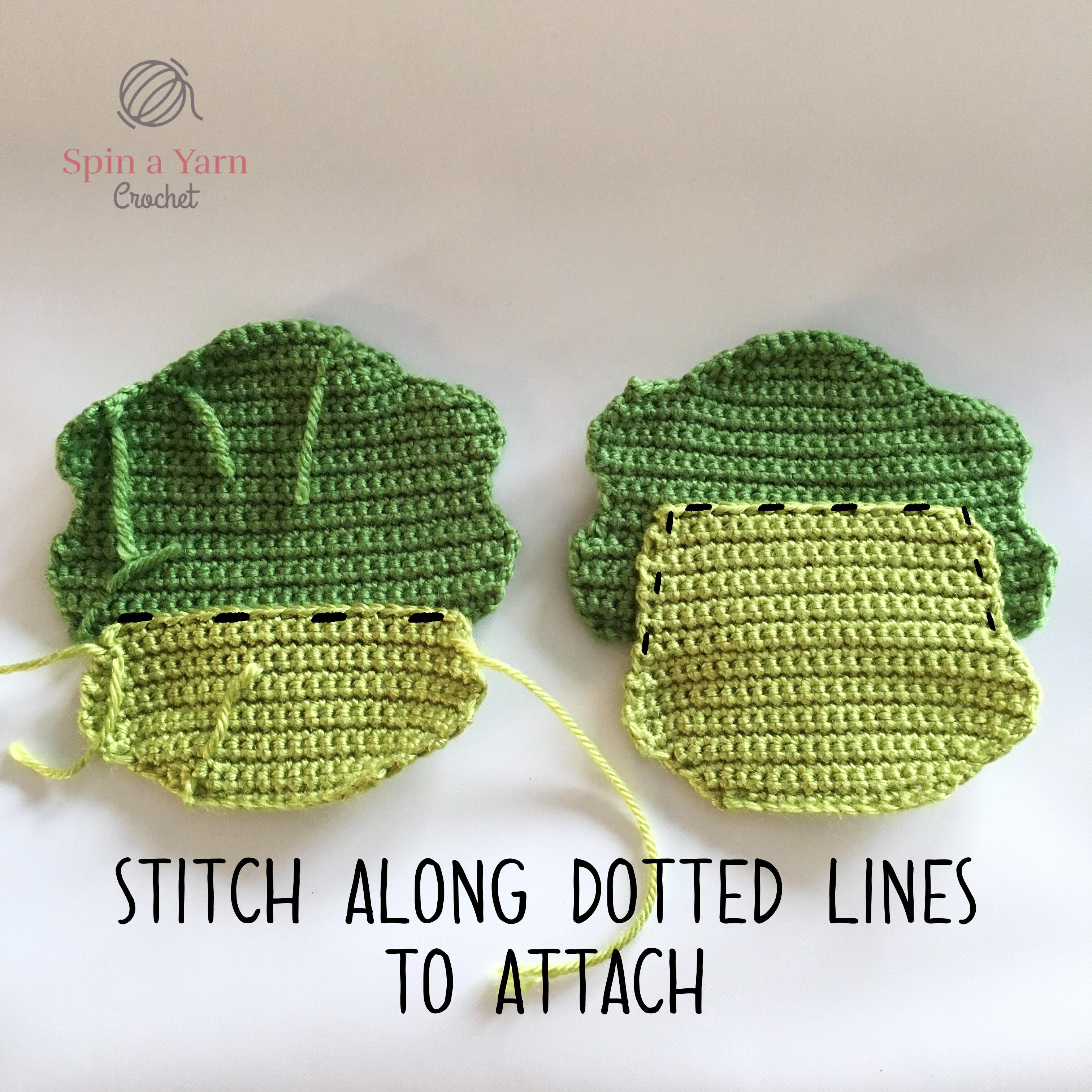 Stitch the head to the body (as shown by the dotted line in the photos above) using light green yarn. Be sure you stitch through all three pieces, the front panel, the body and the back panel. When finished, tie a knot to secure and hide the yarn tails inside the piece.