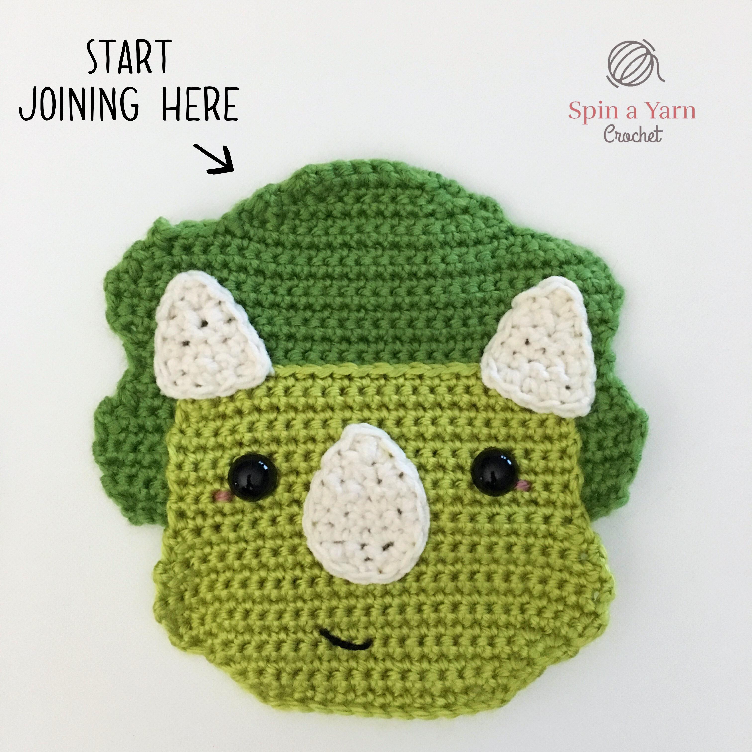 Work the last bobble horn at the top of the last bump (at the top of the frill). Once the head is stuffed firmly, continue to crochet around, close with a slst to first st. Tie off. With your tapestry needle, poke the yarn tail back inside the piece.
