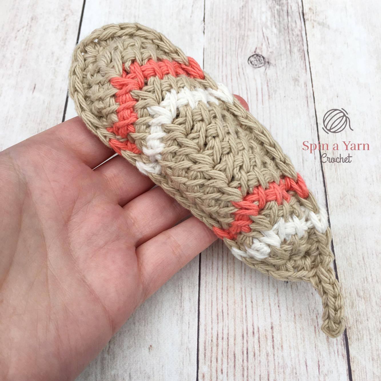 - You will need two panels (feathers). For the first panel, I followed the pattern for the Tunisian Feather right up to the last row (whether it’s the large or the small feather), however, I did not ch 6 and slst back down the chains for the stem at the end. Instead, I tied off after the last st of the row.