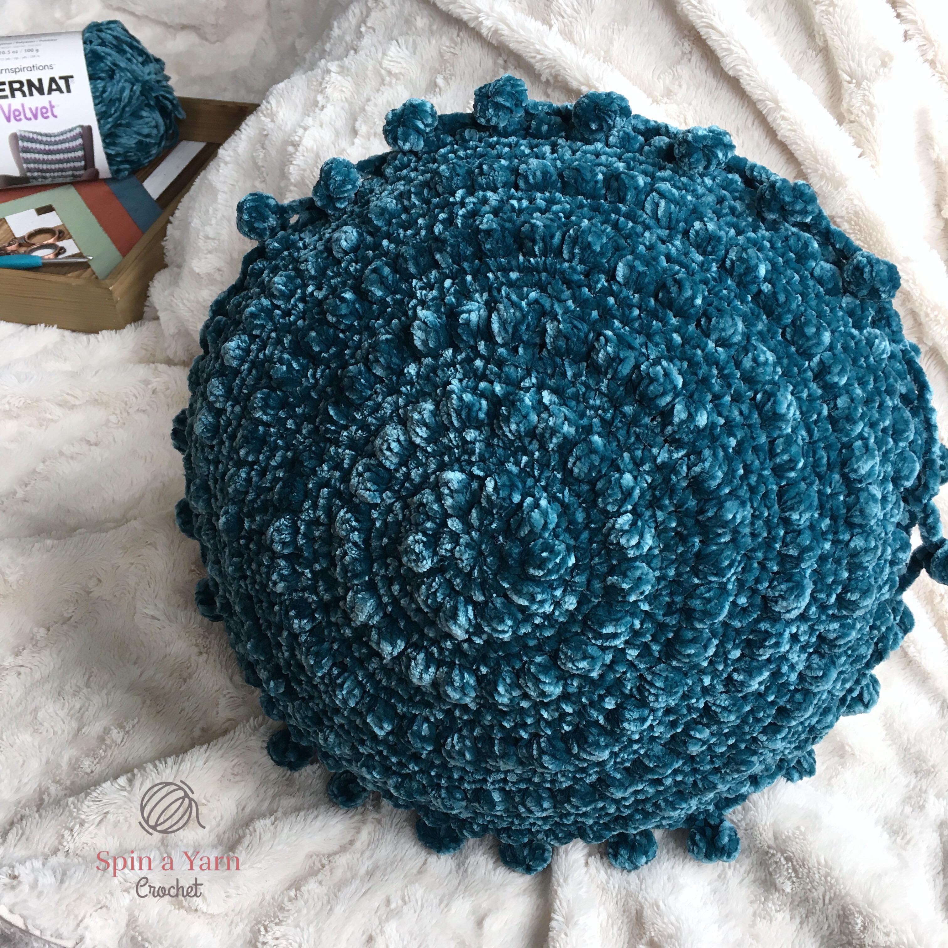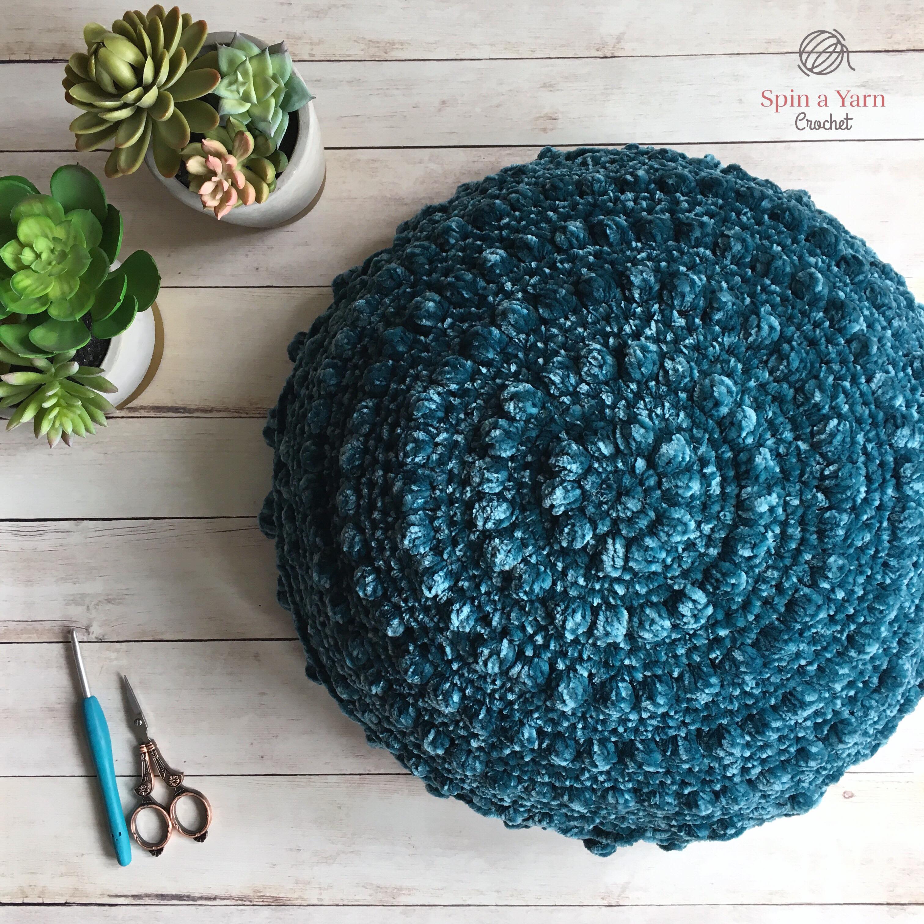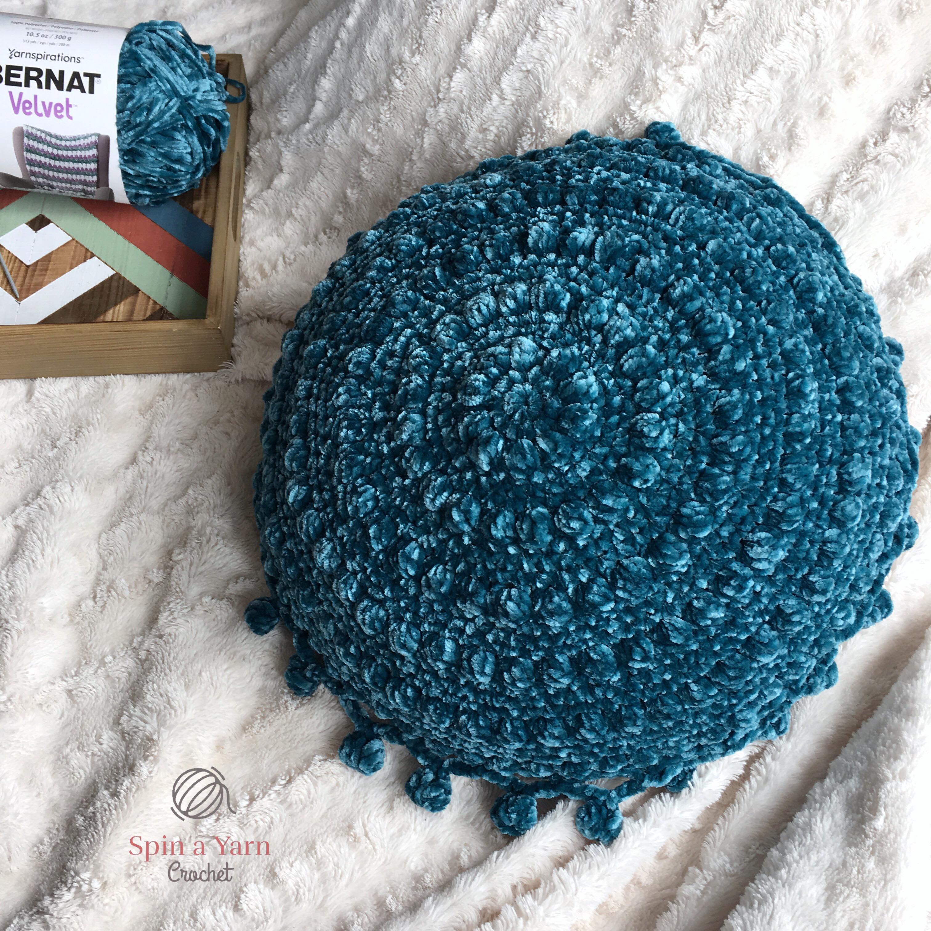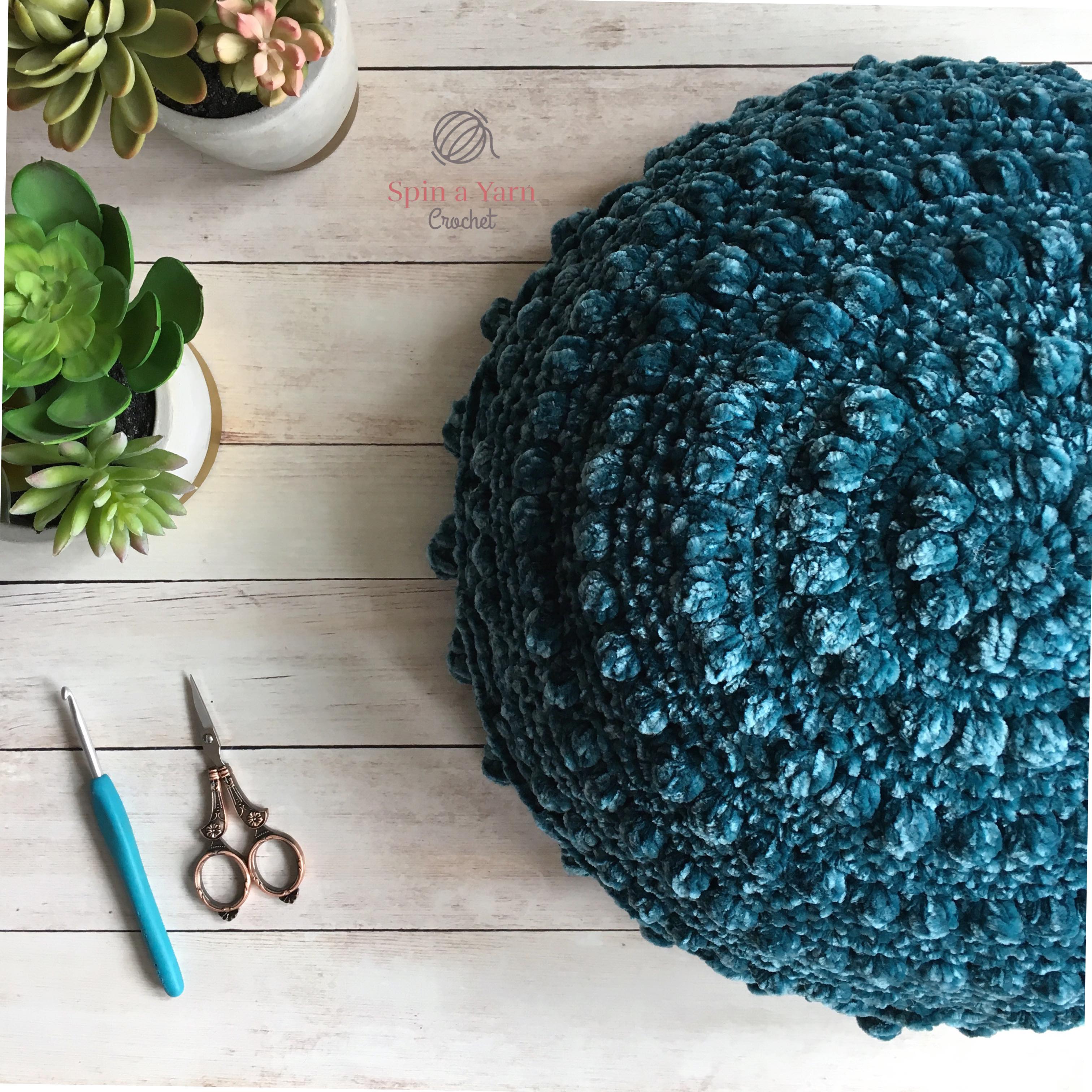 ” (I mean, can you even think of a better yarn colour name??) and it was totally calling my name. I have an accent chair at home in almost the same colour and I couldn’t resist picking up a couple of skeins to make a cushion. I had not worked with velvet yarn before so I was excited to see how it worked up, being so soft and luxurious!