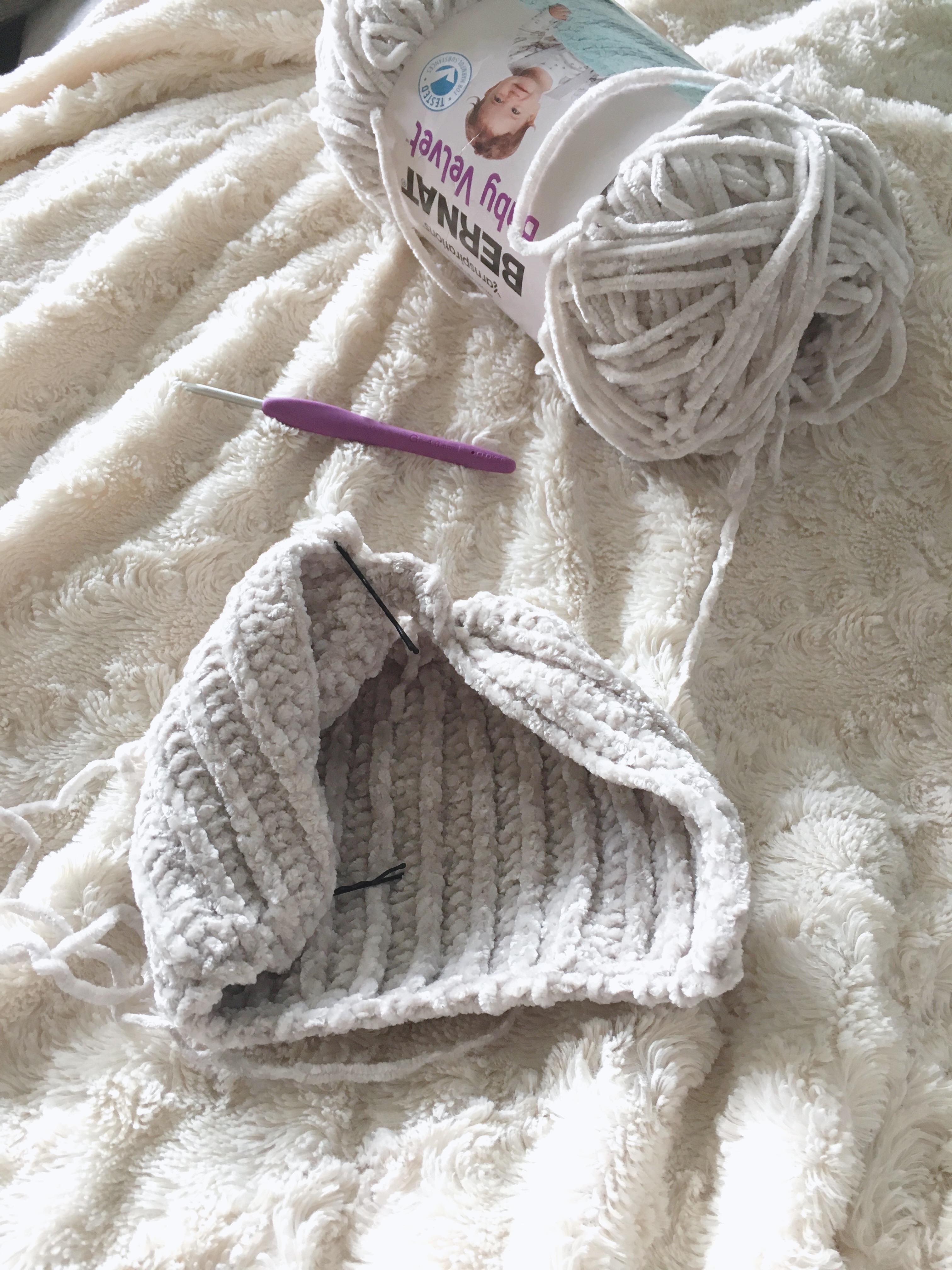 Ack! Can’t believe I forgot to mention this in the post. I used a 4.5mm with the “Greige” velvet since it’s worsted weight, and a 5mm with the black velvet, which is bulky.