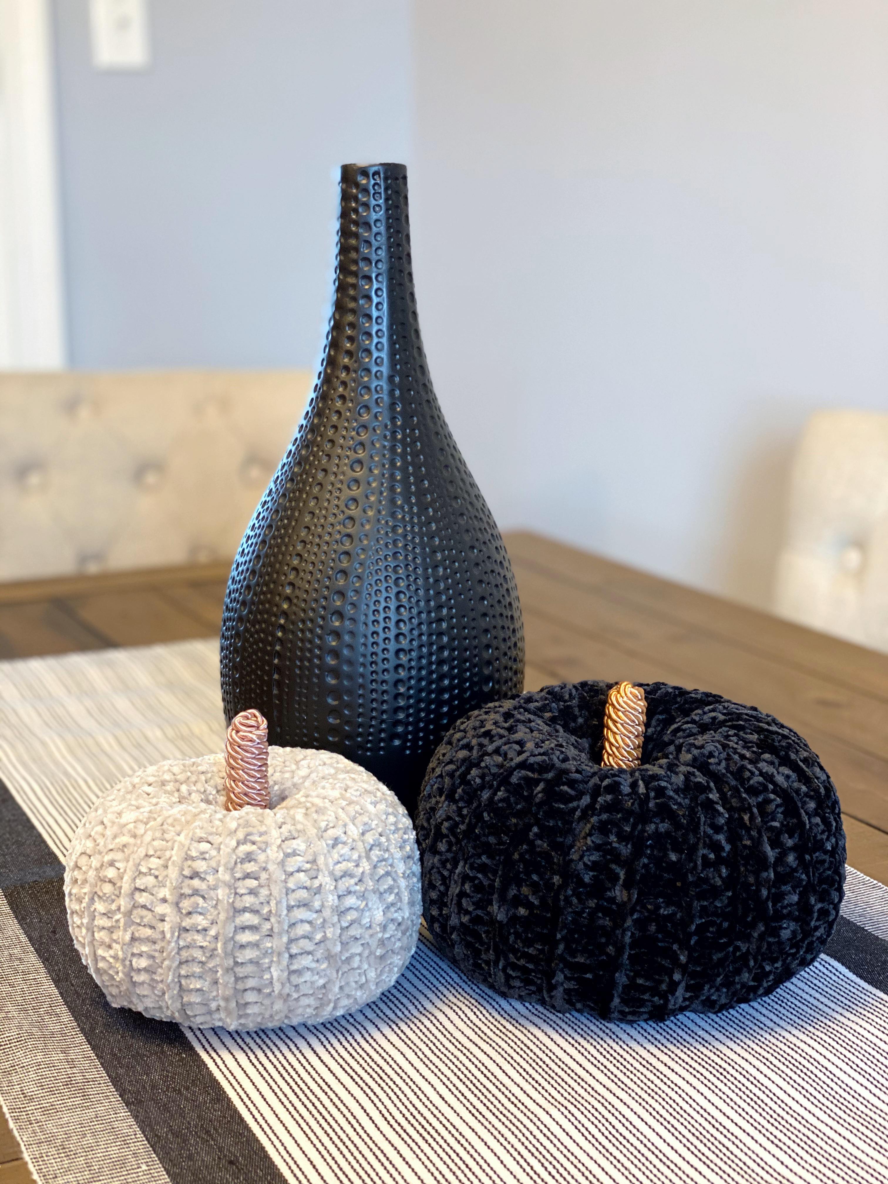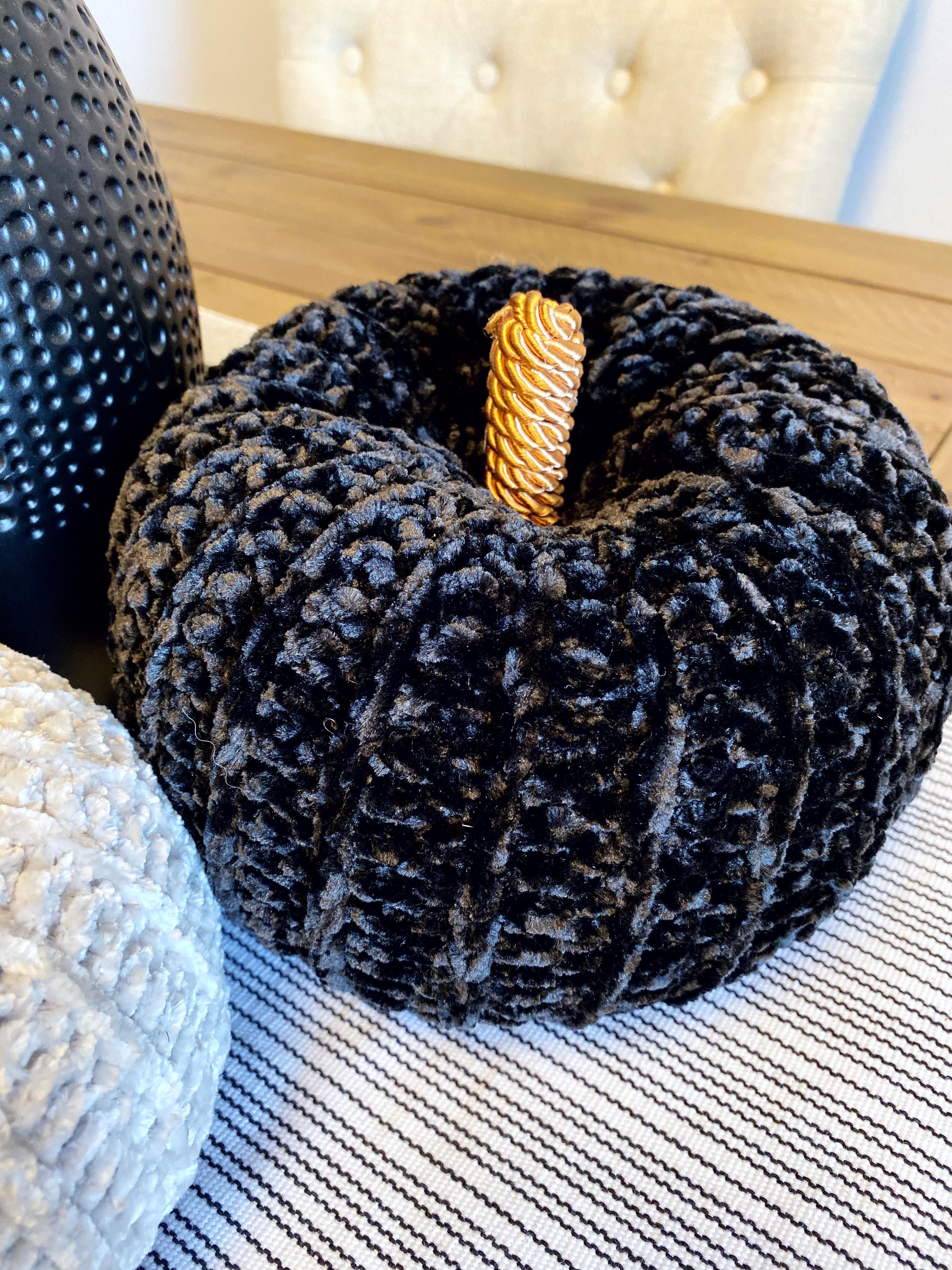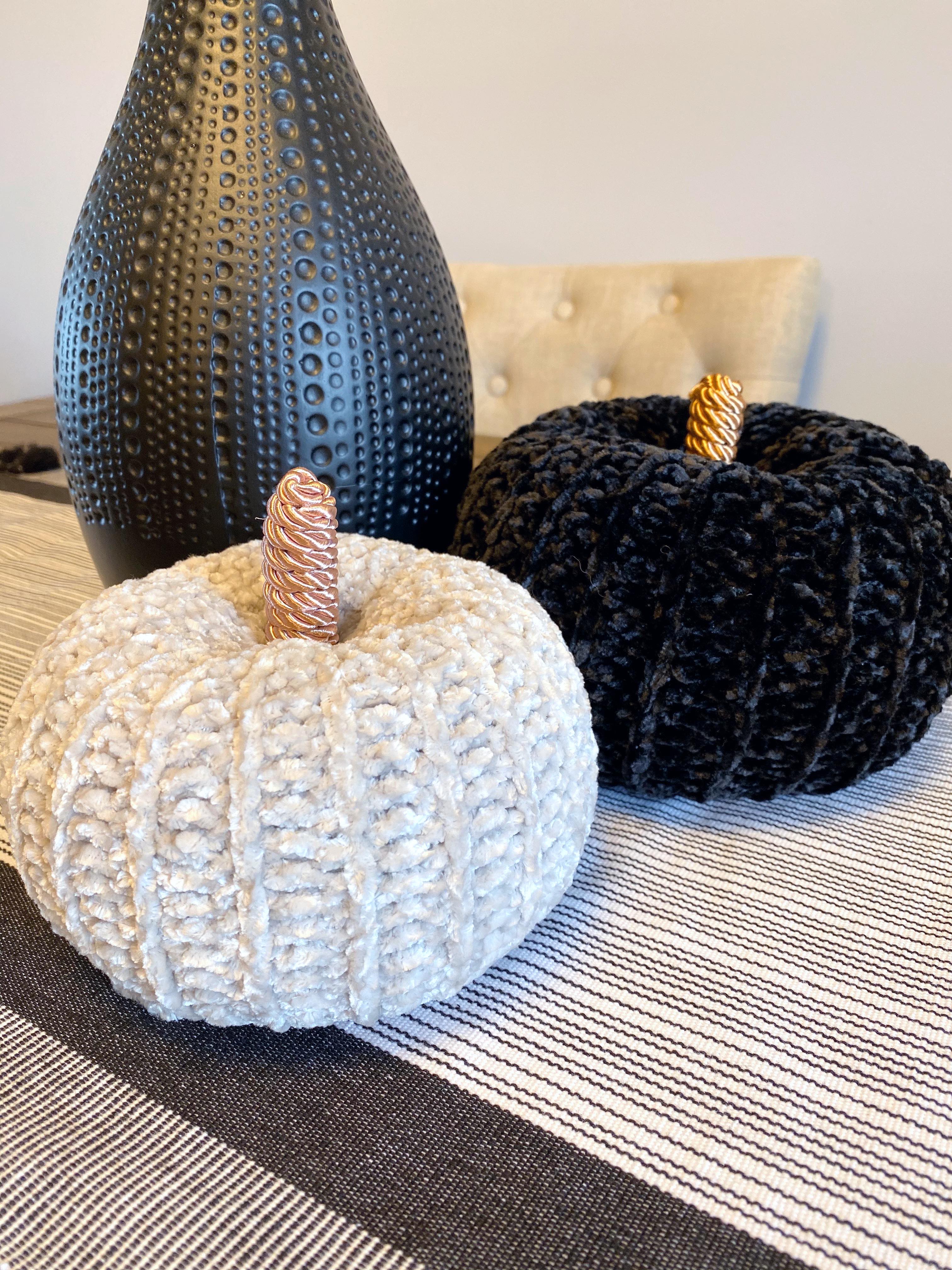 I can’t let a Fall season go by without crocheting at least one or two pumpkins (can anyone?). This year I had some velvet yarn kicking around that I picked up on clearance (yep, I’m still on the velvet train and I’m not disembarking anytime soon) and I thought the velvet yarn would make some deliciously luxurious pumpkins (spoiler alert: I was right). Conveniently, I do have a black and white decor thing going on in my kitchen at the moment, so I decided to whip up a couple of velvet pumpkins to add to my table as a centrepiece in black velvet and “greige” velvet.