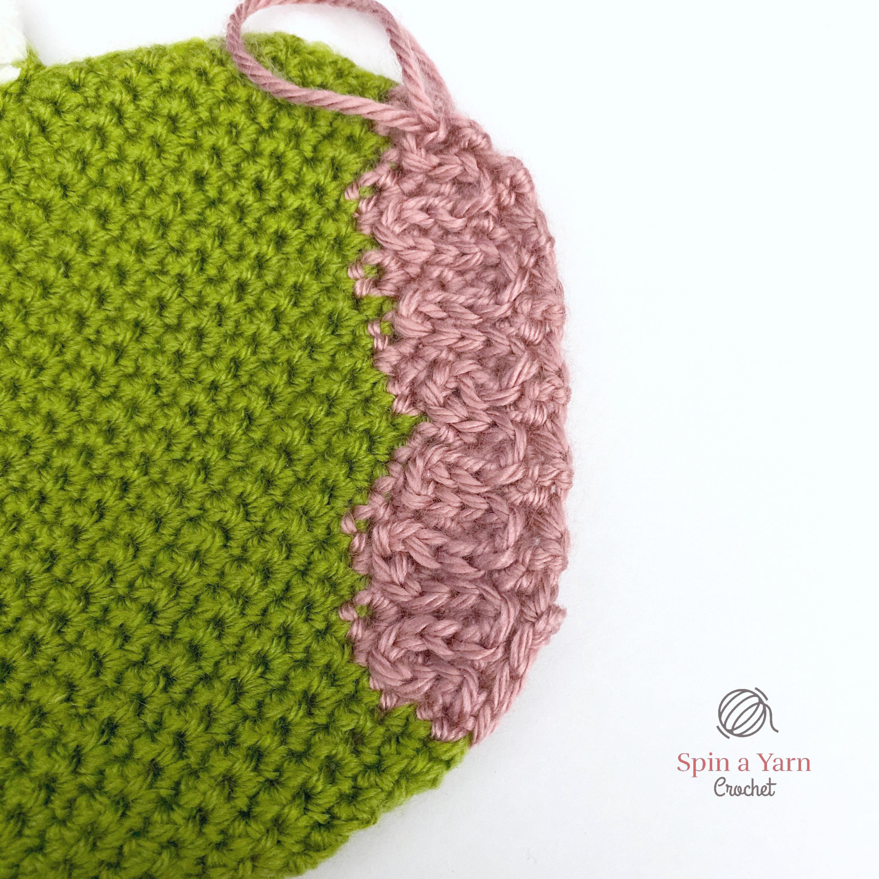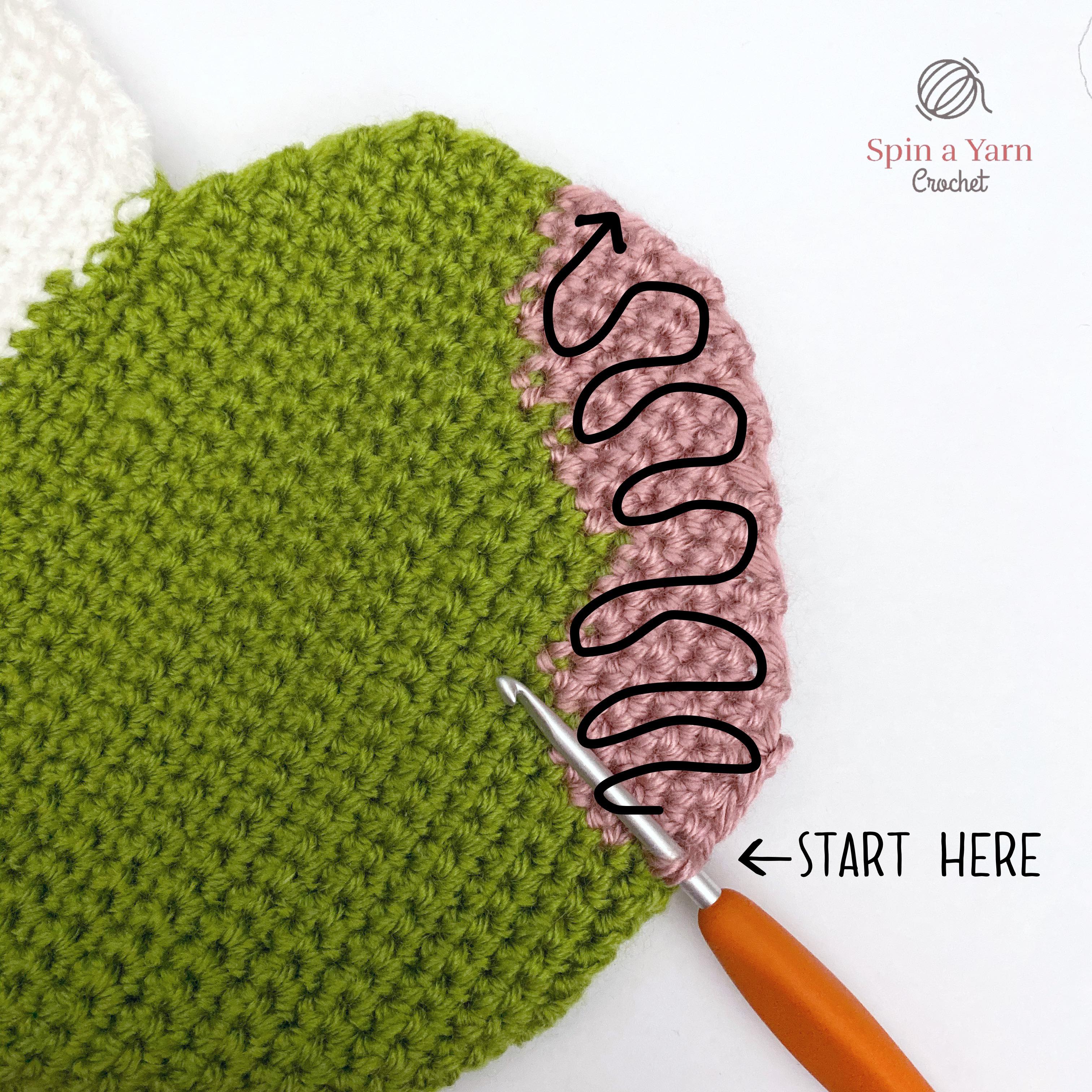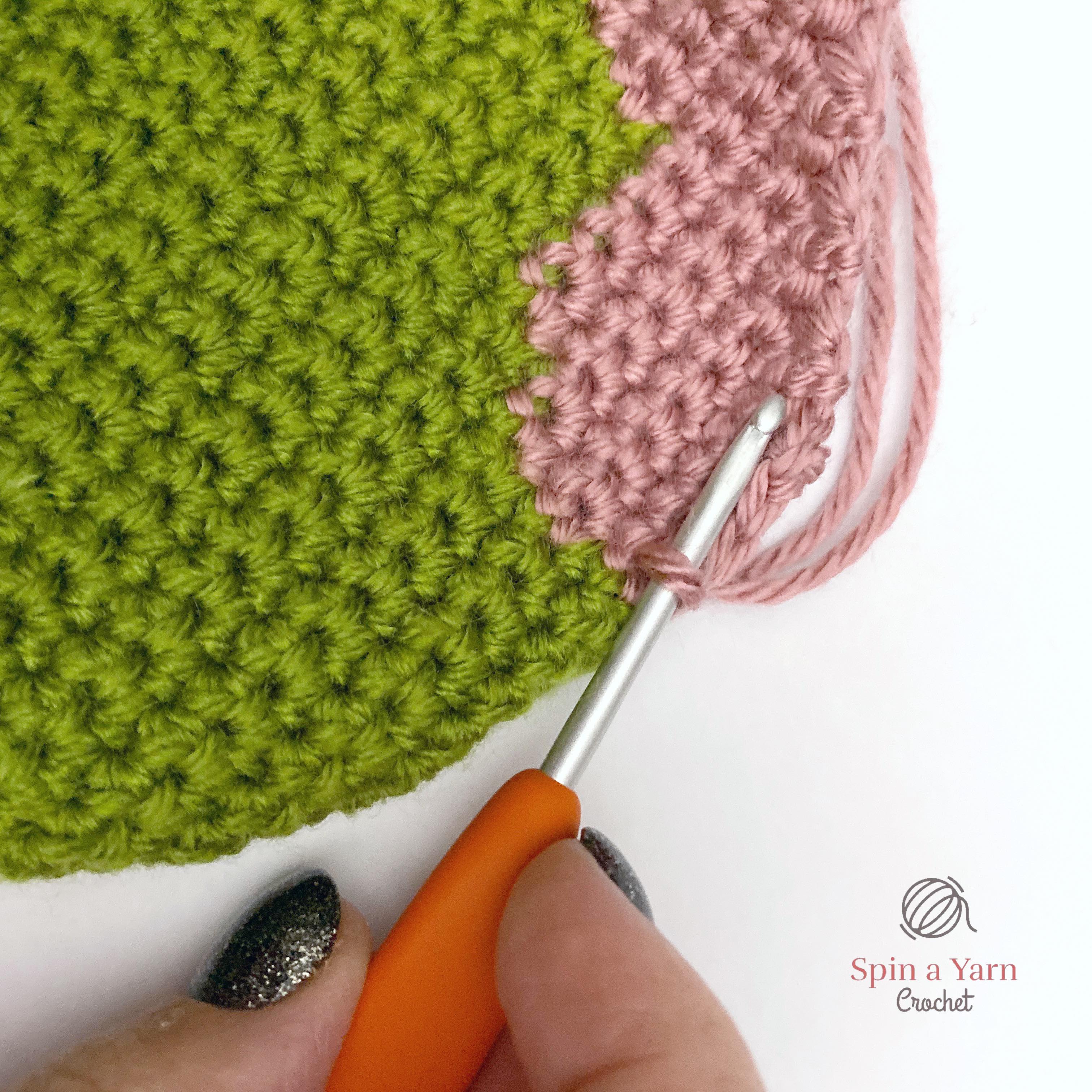 Everything is worked in single crochet stitches, unless otherwise specified. So, in order to indicate the colour-changes, I have omitted the usual “sc” in front of the stitch counts in lines with colour-changes and I’ve used the associated colour letter instead. For example, “Ginc” means to work a sc increase in green yarn. “G10, P7” means to work the next 10 sc in green and the next 7 sc in Pink. “Bdec, G8, Bdec” means to work a regular sc decrease in black, then work the next 8 stitches in green, then work another sc decrease in black, and so on.
