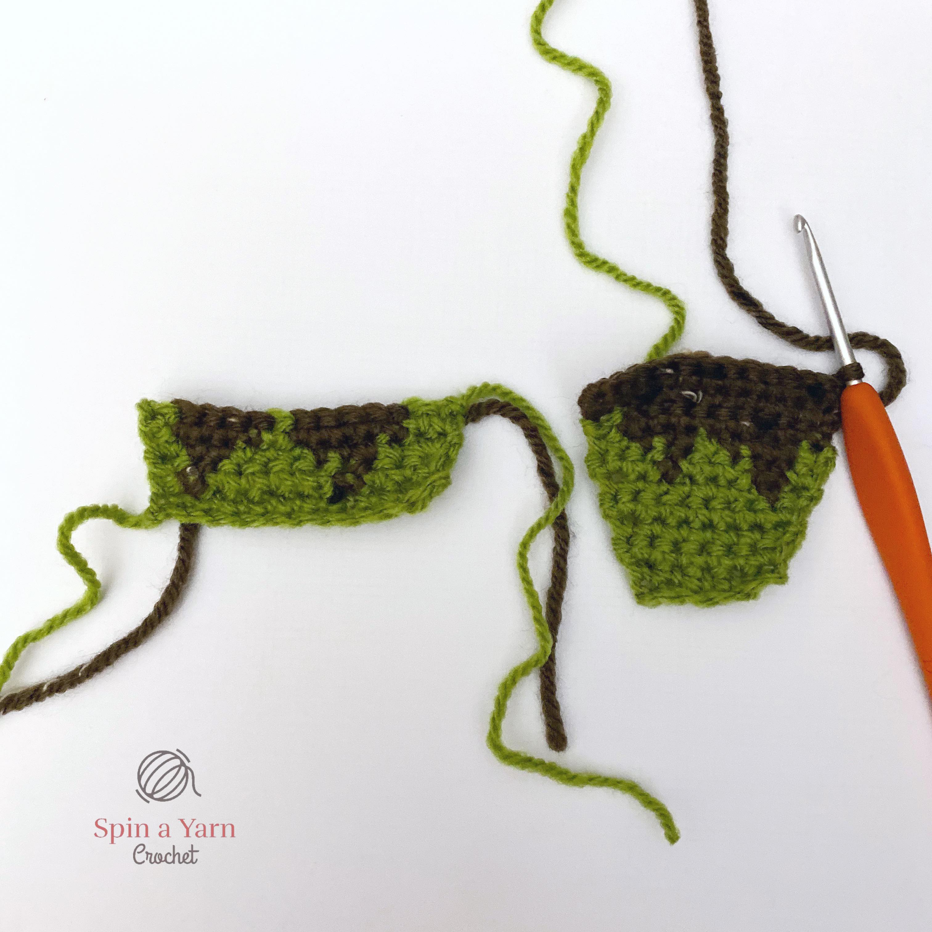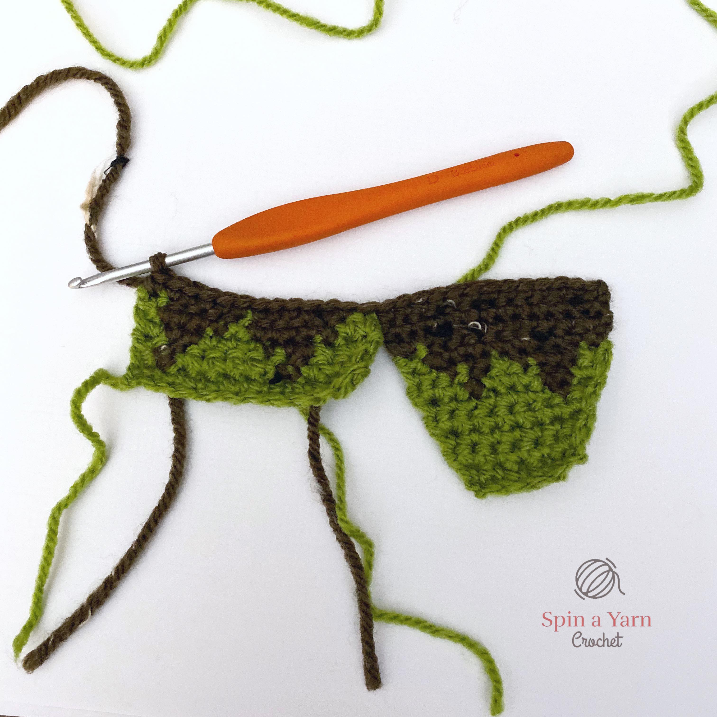 Switch colours to Green and then to Brown as you crochet down the body. Stop when you get to the bottom of the first leg.
