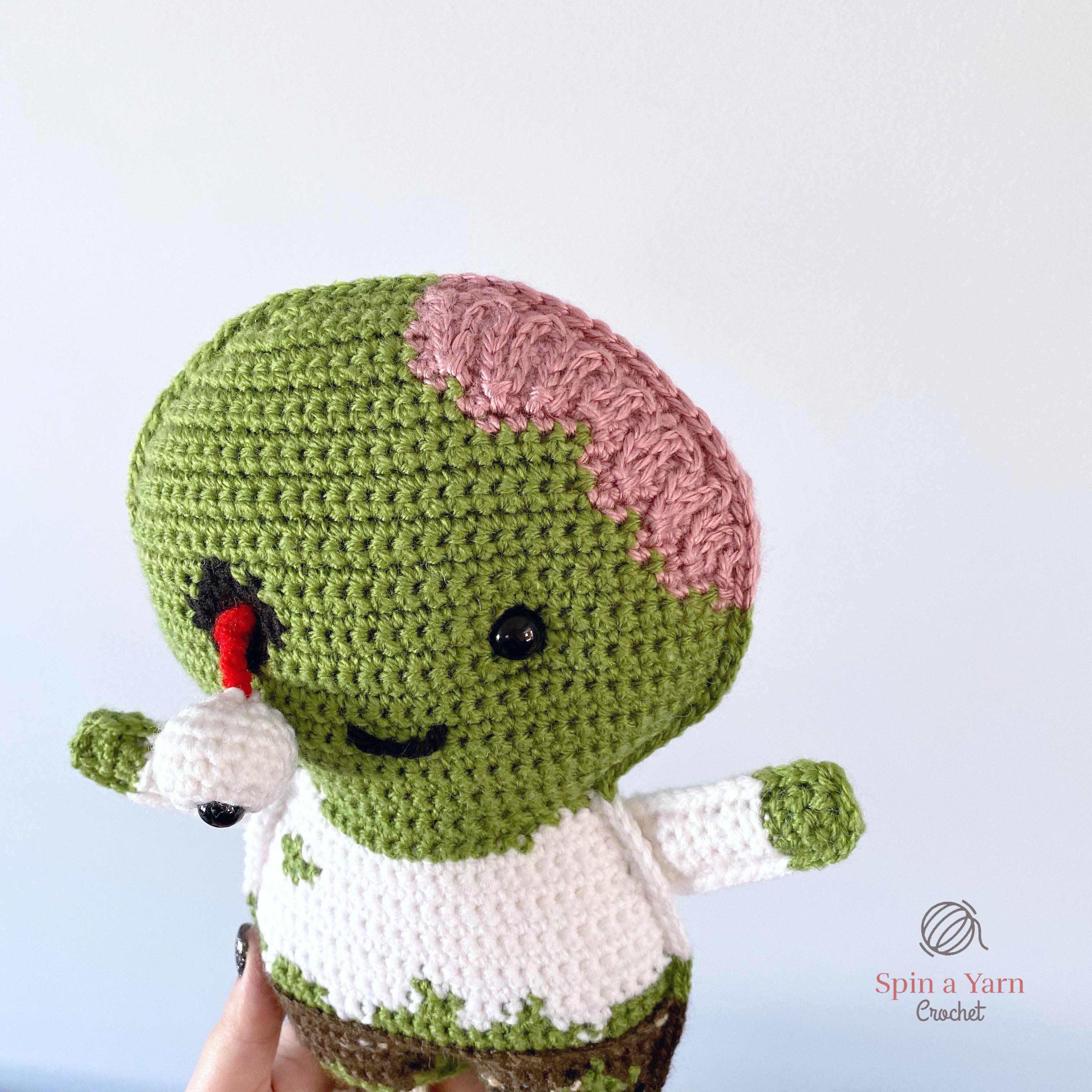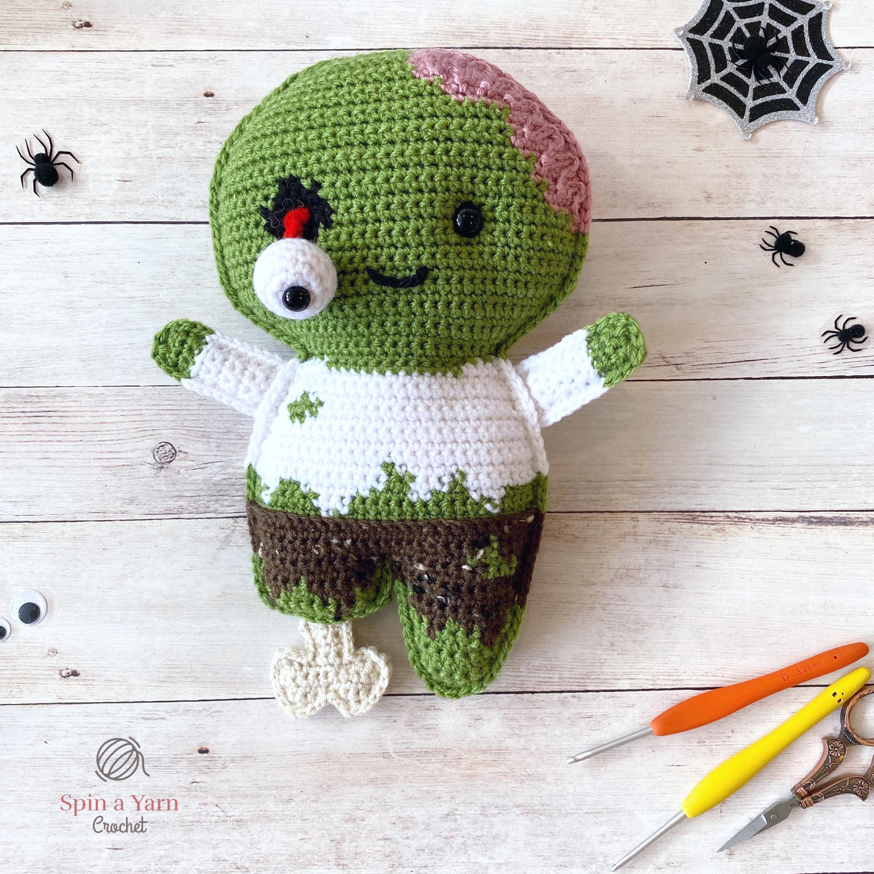 Braaaains…! Does it get any more creepy-cute than this? I’m pleased to add this zombie friend to my other Halloween patterns. (Check out the Vampire, Frankenstein’s Monster, Sugar Skull Ami, and my Pumpkin Keychain for more fun Fall patterns).