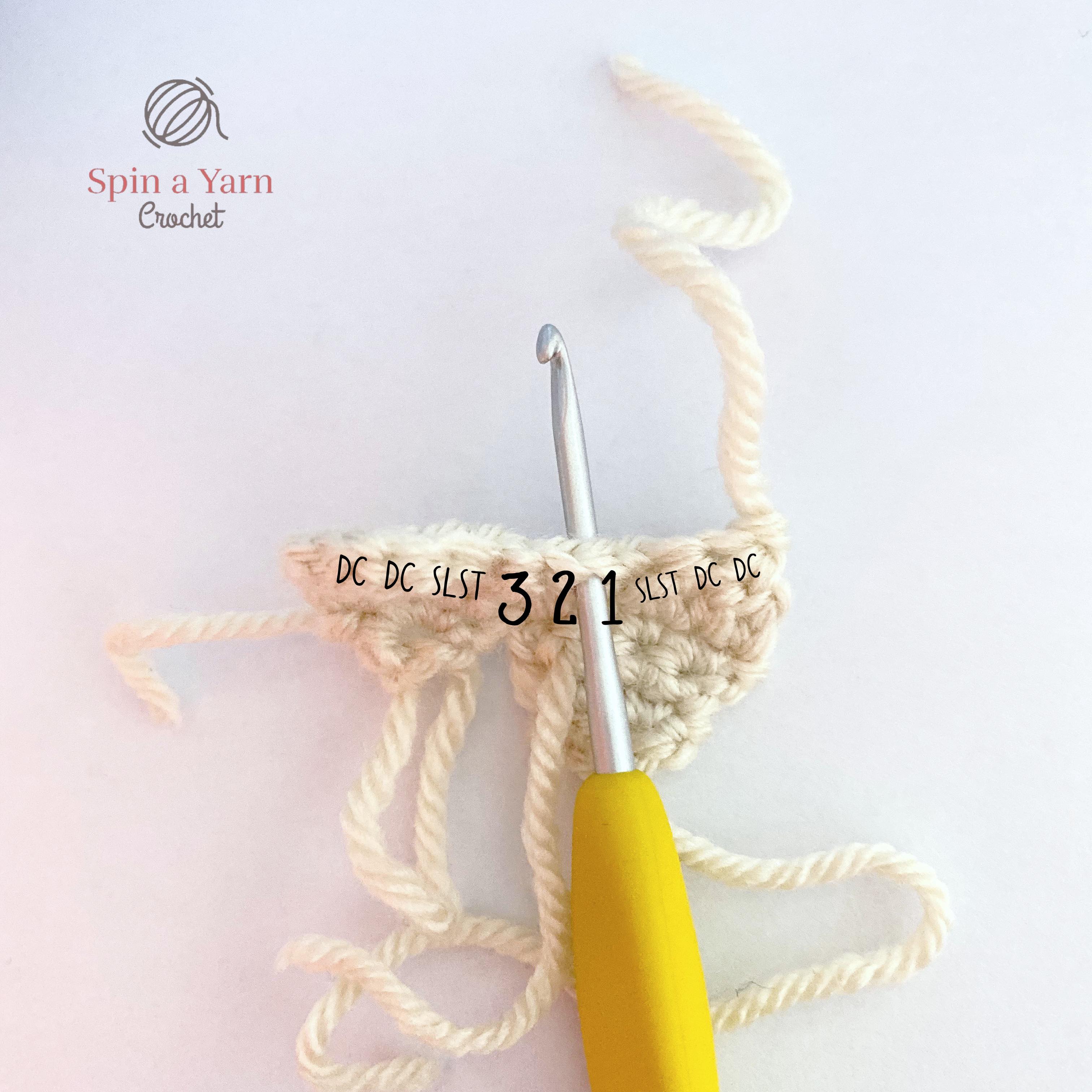 Row 5: Dc2tog, dc, slst, sc 3, place a st marker in last worked st, slst dc, dc2tog (9 sts)