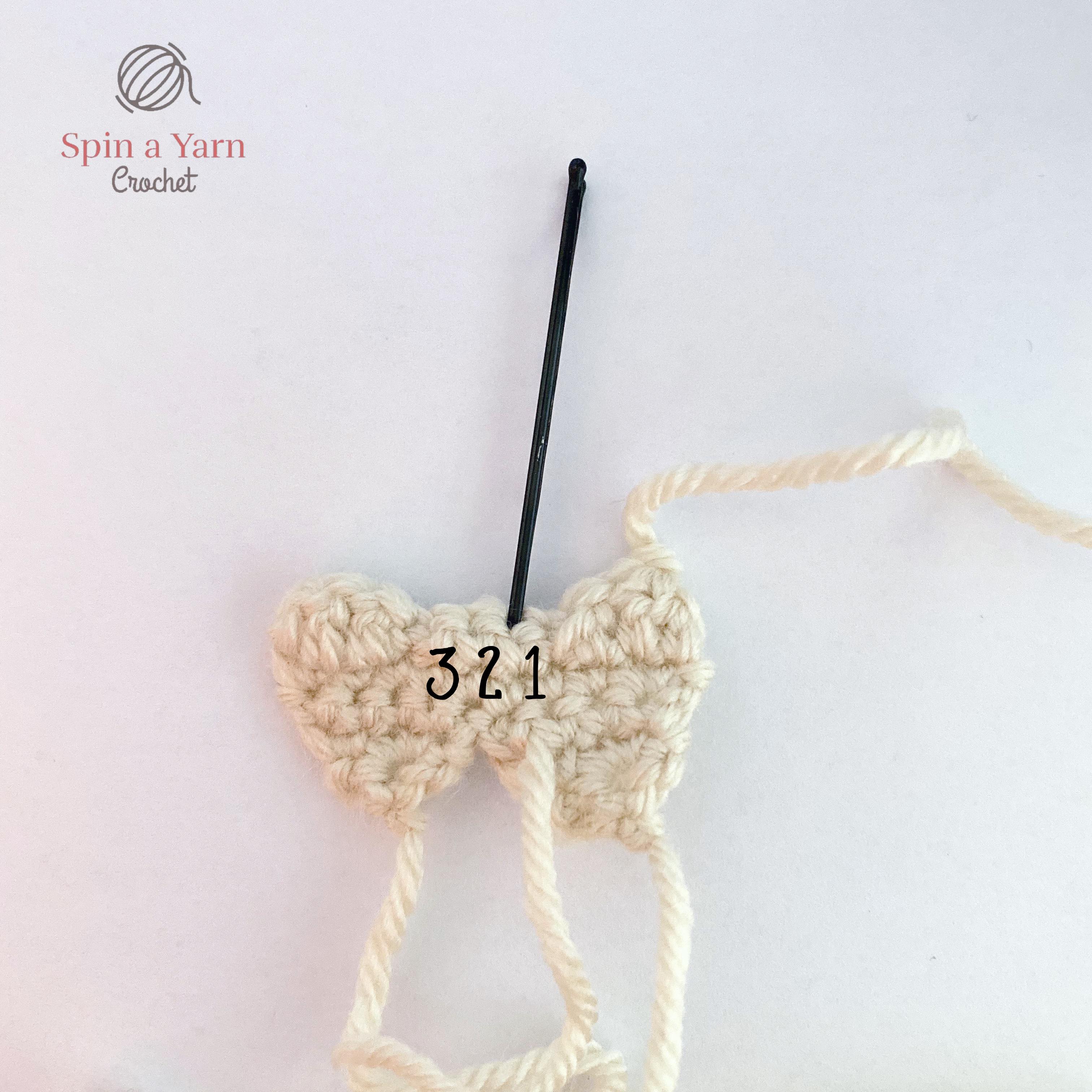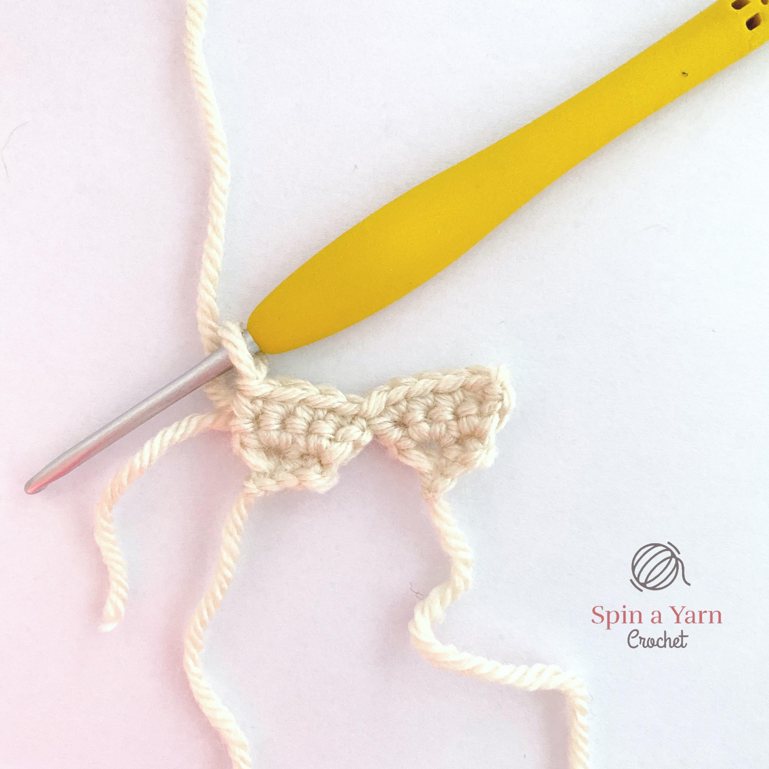 Tie off. Repeat rows 1-2 but do not tie off. Ch 1 and turn. Continue to row 3 below to join both pieces together.